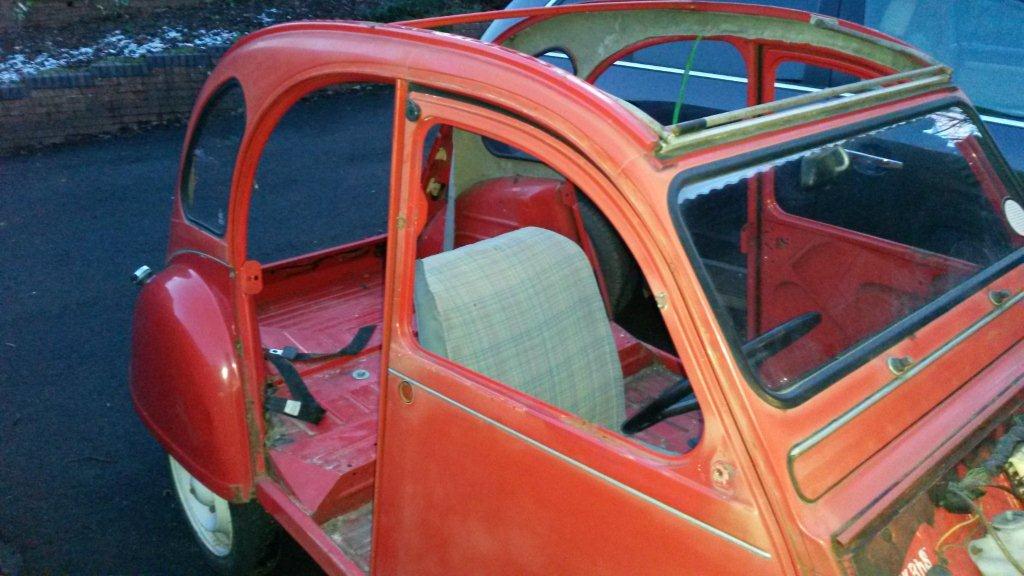 As the weekend continued, so progress on the car disassembly took leaps forwards, due in part to the simple construction and ease of accessibility of parts of a 2CV. As has been previously mentioned, all four doors have been stripped of glass, interior trim and lock mechanisms, some of which was a little fiddly and required patience, front end panel work has all been removed – a painless and simple task requiring the removal of only a few nuts and bolts, and indeed, something that had been done previously by myself when servicing. The roof has been rolled up and removed, together with the rear window and finally the boot lid has also been taken off. Front seatbelts have been unbolted so as to check the mountings are sound, but rears proved a little more awkward and need a second spanner on the underside. This will be the first task next time!