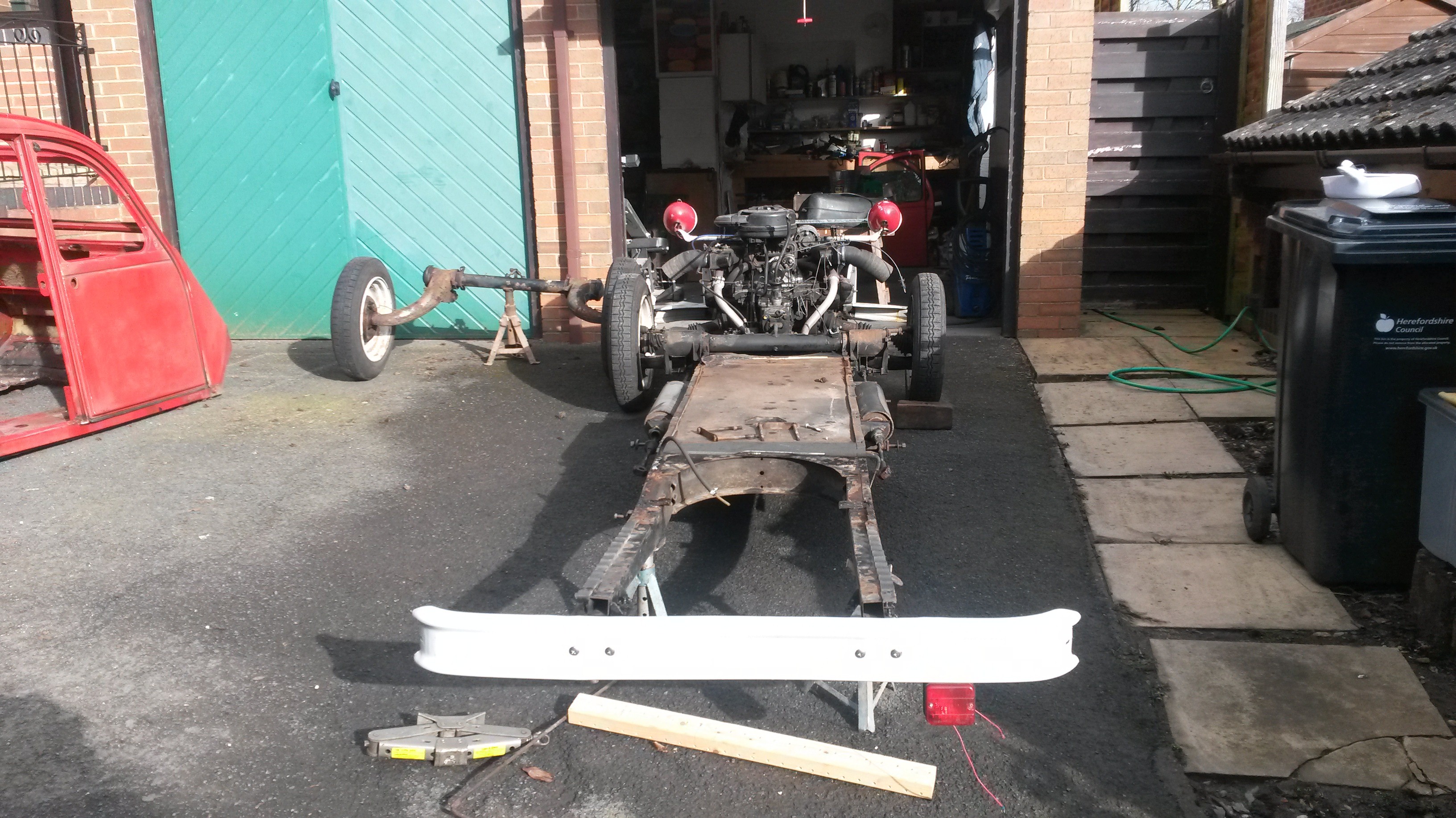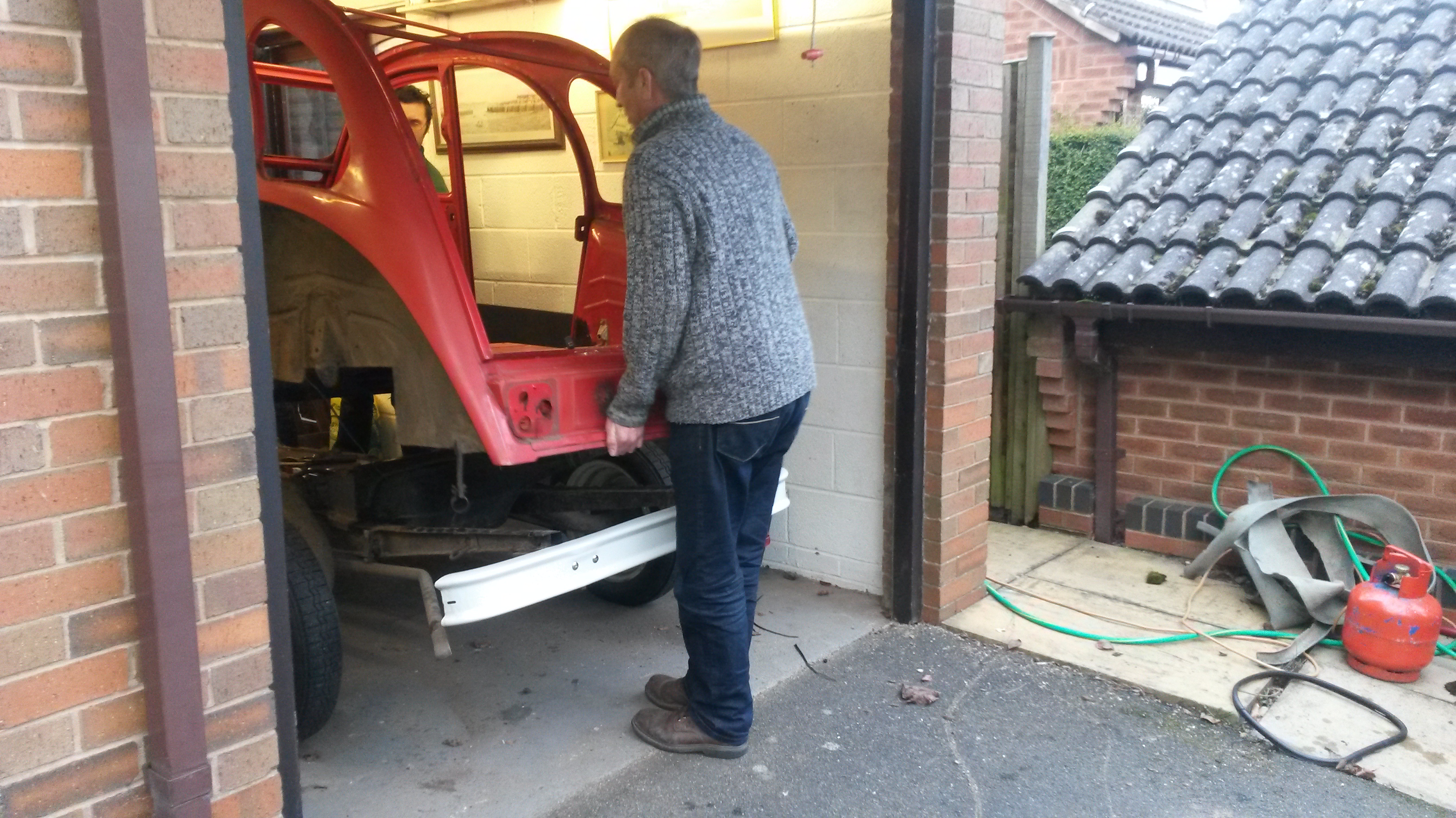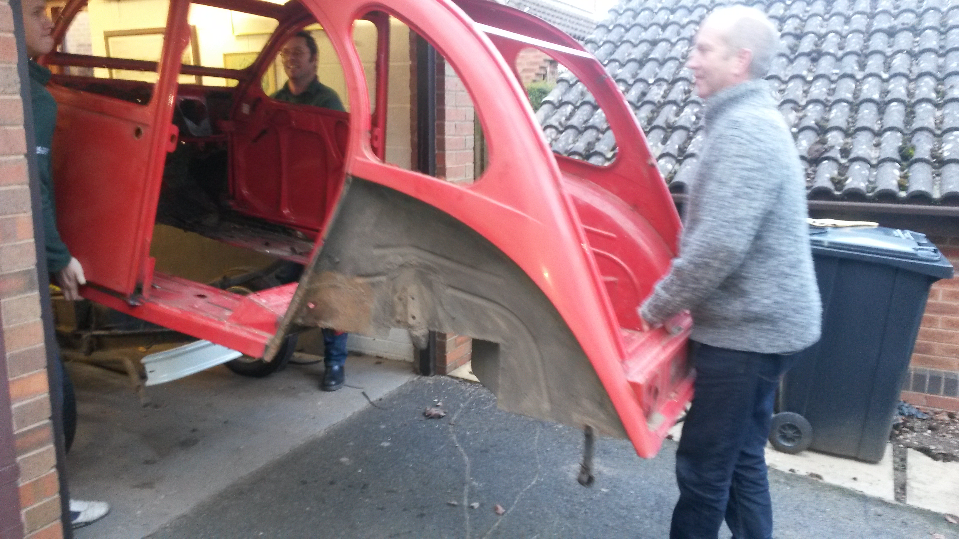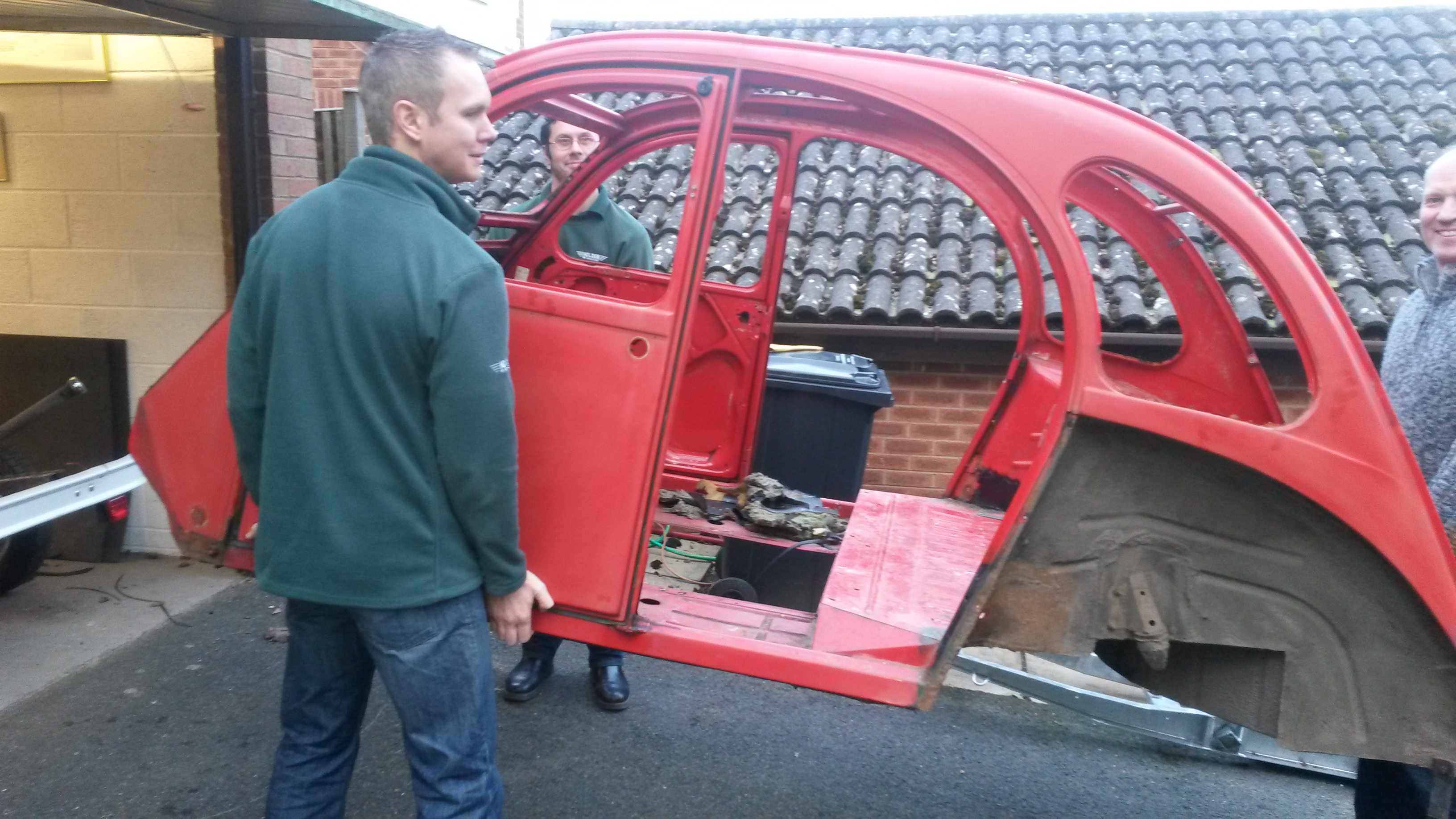 Body off….Simon and Adam from work helped lift the body off the chassis on Friday evening, this is now outside, where it will remain ’till the end of March when it will go to Sparrow Automotive, http://www.sparrowautomotive.co.uk for a new floor to be welded in.