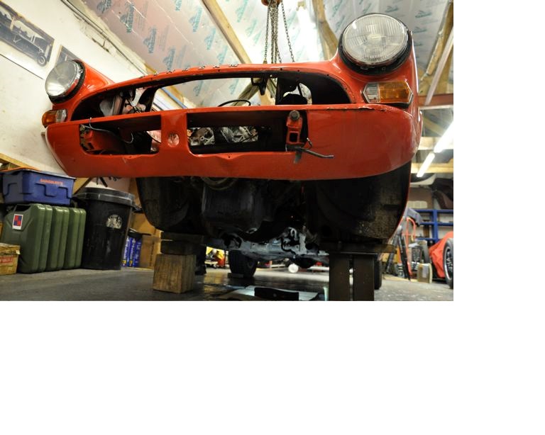 As can be seen from the selection of images below, the major mechanical lumps have now been removed from the shell (engine and gearbox are ‘dropped’ out of the bottom whilst the shell is lifted), the front sub-frame removed in one piece, complete with its wheels and the rear leaf springs unbolted and the axle rolled clear complete.