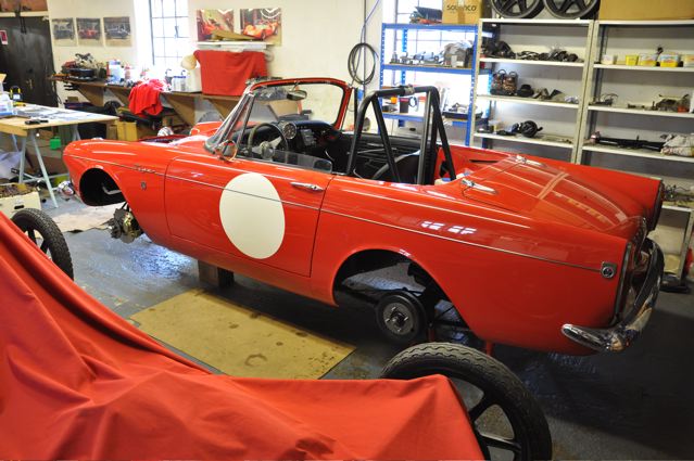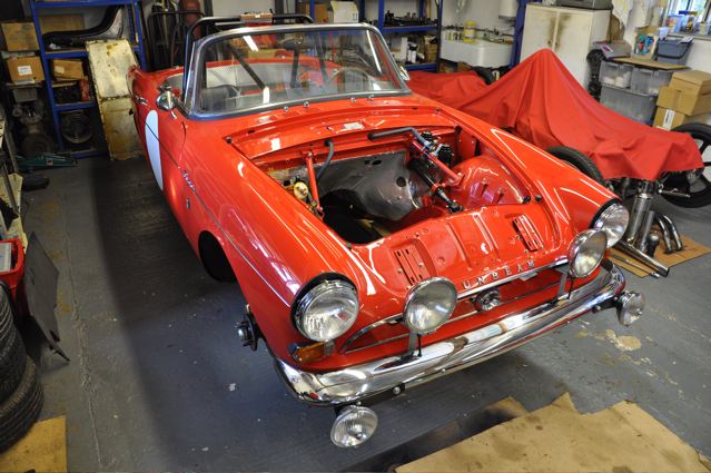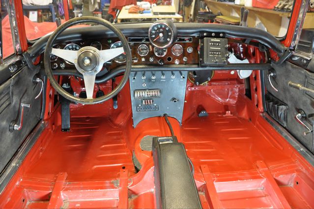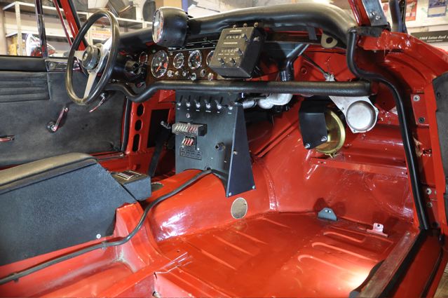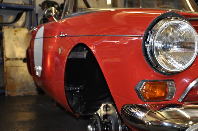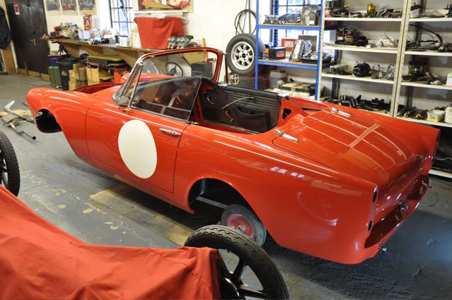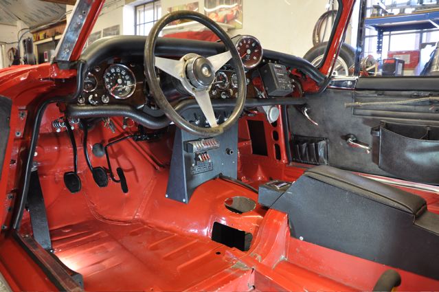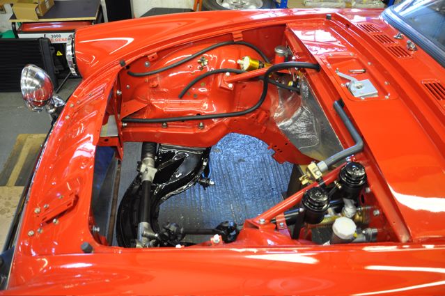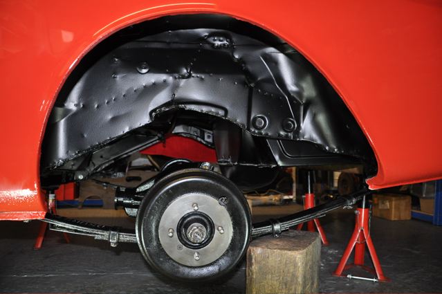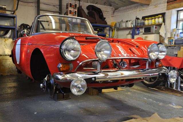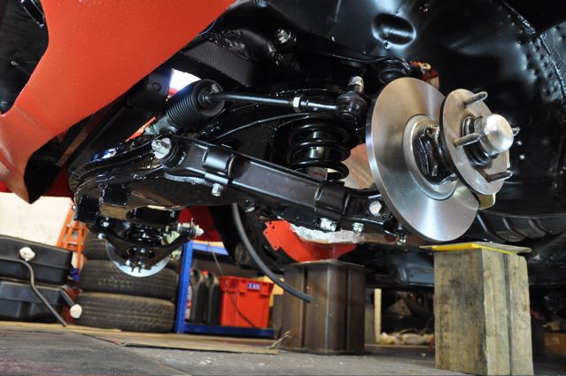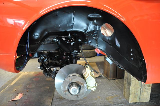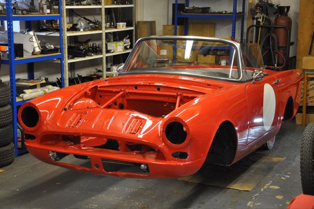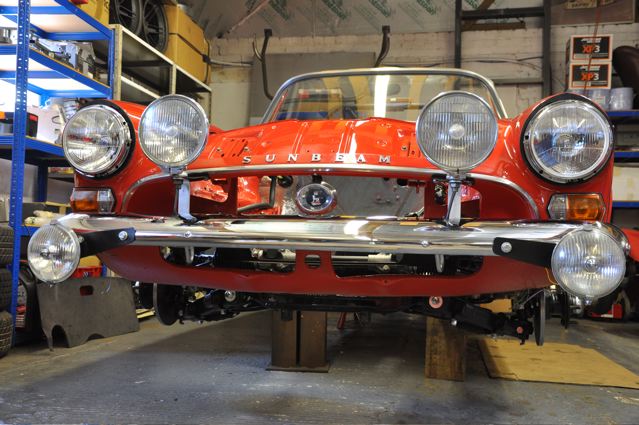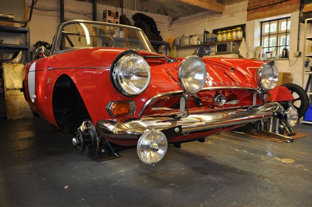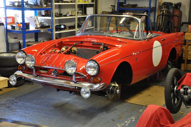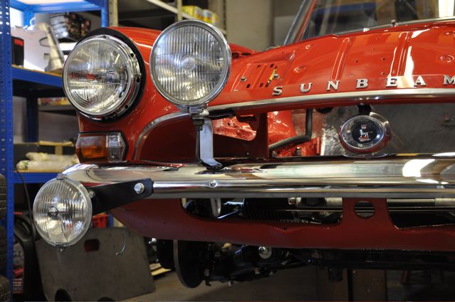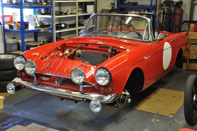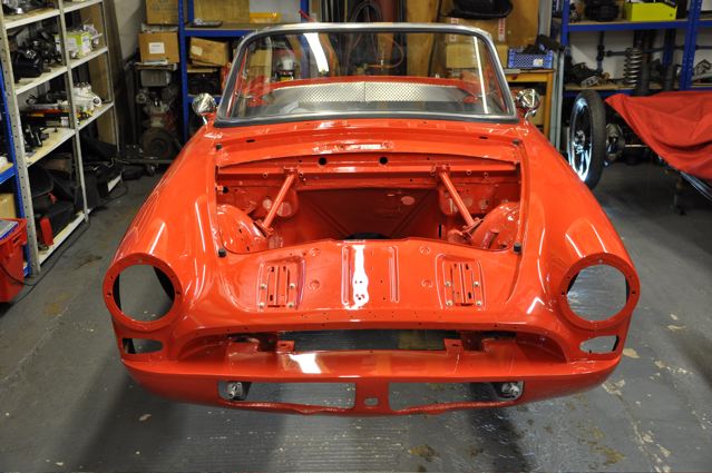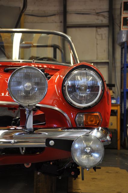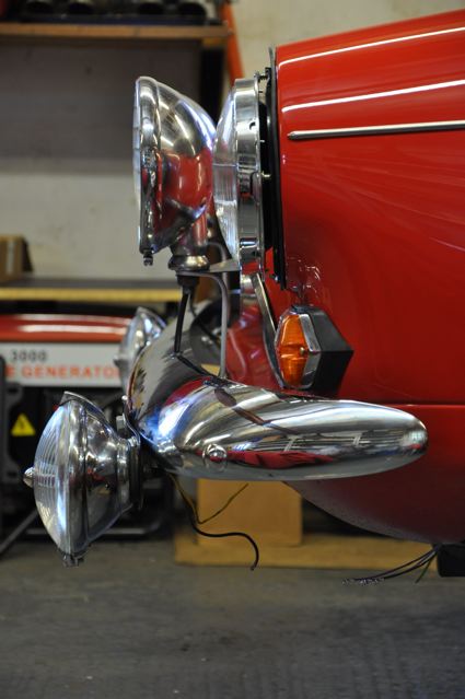 Time has definately passed since the last news of the Tiger rebuild. However, the painted shell has been quite literally descended on by a great collection of parts that have been carefully restored during the period whilst the shell was away. Some parts were done by Jonathan and team at Hardy Hall, some here in our own workshops – mostly things electrical – and others by outside specialists – brake calipers, rear axle etc etc, The car has now reached the stage where, it looks reasonably complete – Shiny bits are back on, dash and instruments installed, what trim there is reinstated, and most importantly front suspension and rear axle installed. The car is now in a position where it can sit on its own wheels and be moved – indeed it is imminently heading to Vehicle Wiring Services (www.vehiclewiringservices.co.uk) who will manufacture and install the wiring loom. All we are needing now is the engine and gearbox – which currently is waiting for a set of pistons!! The deadline is looming……….