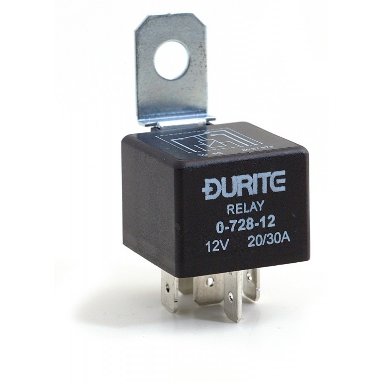 A Relay is an electrical switch which uses low wattage current to open another switch. It is this second switch that carries and switches the high wattage current. This is a modern encapsulated general purpose Relay. It has a bracket with a fixing hole or can be used with a relay socket. It operates on 12 volts up to 20 amps and switches from one circuit to another when energised, for example main beam to dip. Base is marked 87/87a/86/85/30.