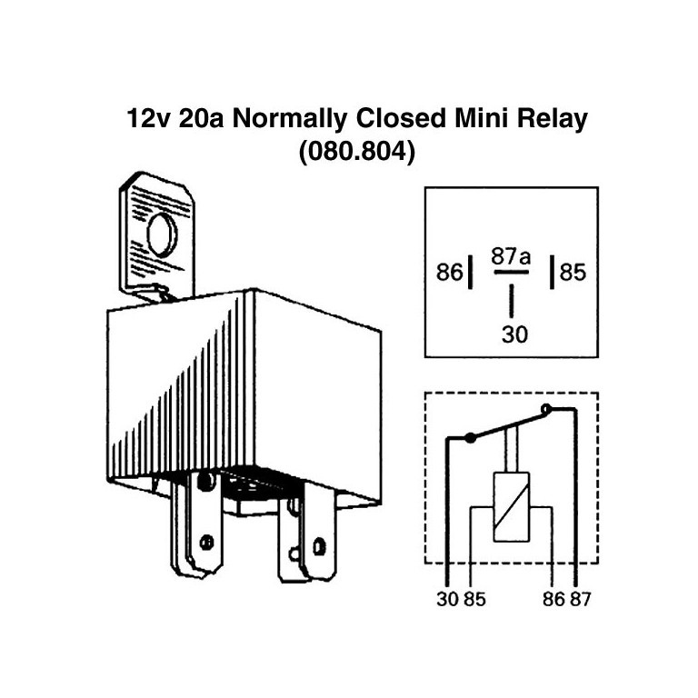 A Relay is an electrical switch which uses low wattage current to open another switch. It is this second switch that carries and switches the high wattage current. This is a modern encapsulated general purpose Relay. It has a bracket with a fixing hole or can be used with a relay socket. It operates on 12 volts up to 20 amps and is normally closed. The second switch opens when the first is energised. Base is marked 87a/86/85/30.