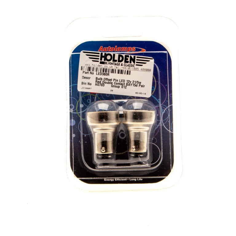 Red LED (Light Emitting Diode) equivalent to LLB380R Double Contact Bayonet Bulb with offset locating pins for rear lamps. BA15d cap. LEDs are semiconductor devices that offer advantages over conventional bulbs of increased brightness, lower energy consumption, and longer lifetime.
