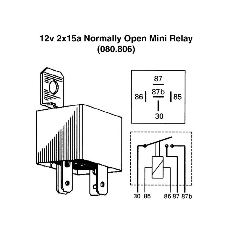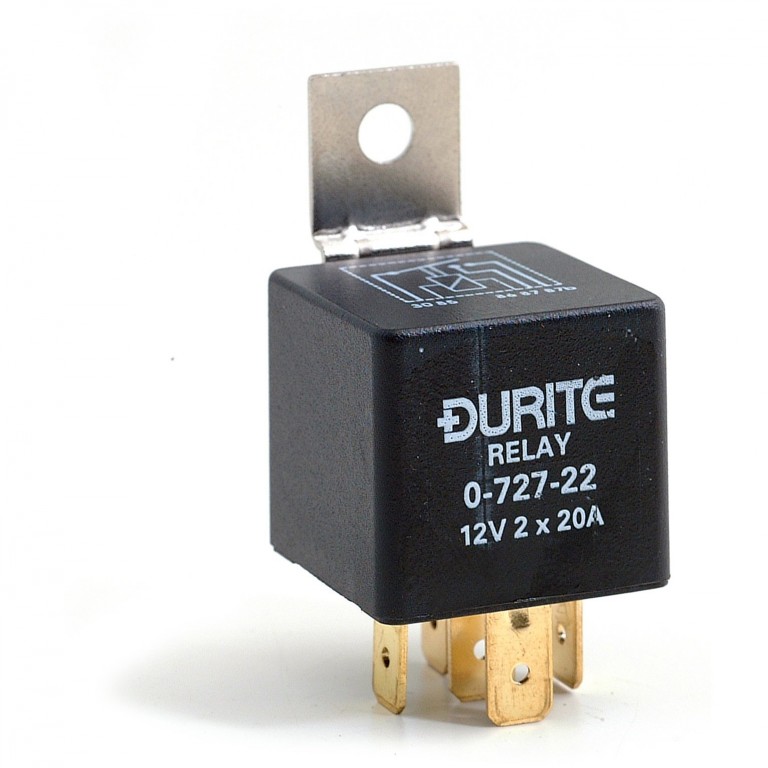 A Relay is an electrical switch which uses low wattage current to open another switch. It is this second switch that carries and switches the high wattage current. This is a modern encapsulated general purpose Relay. It has a bracket with a fixing hole or can be used with a relay socket. It is normally open and operates on 12 volts. When energised it closes two contacts, therefore allowing switching of 2 separate circuits, each capable of taking up to 15 amps. Base is marked 87/87b/86/85/30.