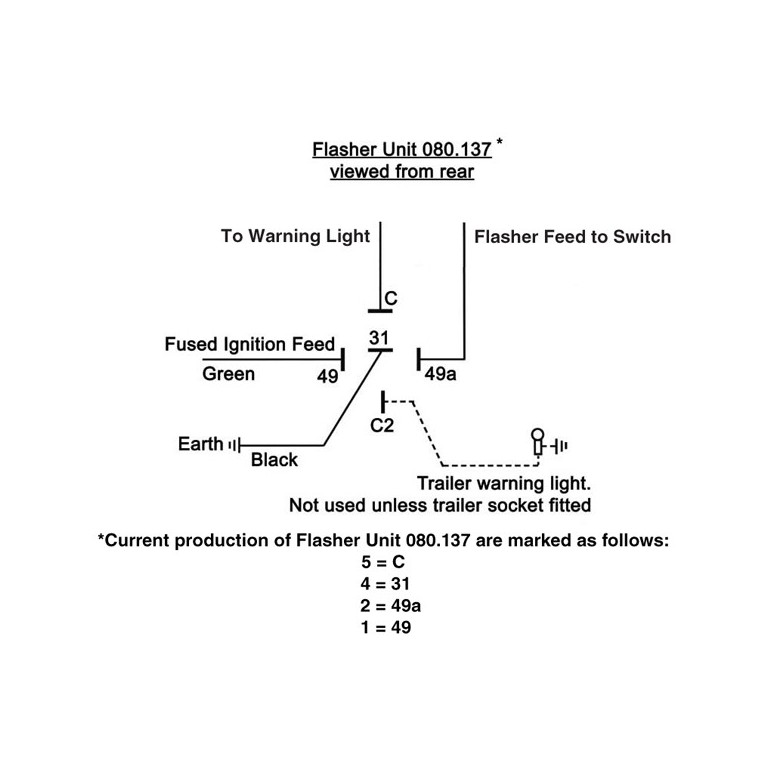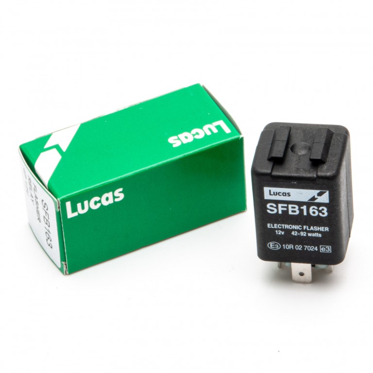 This is the genuine Lucas Flasher Unit SFB163. It operates on 12 volts negative earth and up to 98 watts. Take a fused ignition feed to terminal 1 (also marked +). Connect terminal 2 to the flasher switch. Connect terminal 4 to negative earth (ground). Connect terminal 5 to the flasher warning light (which may be in the switch).