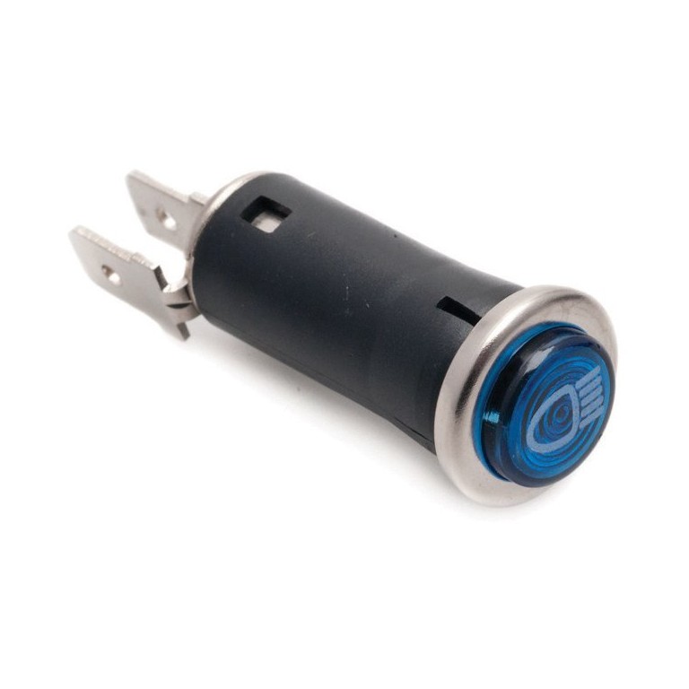 16mm diameter, requires hole 13mm diameter and a bulb LLB281 (order separately). A blue lens with headlamp symbol. A range of warning lamps of this type is available with different symbols and in various colours.