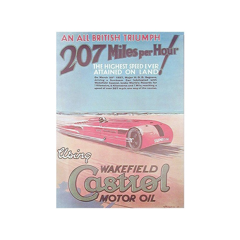 On March 29th 1927 Major Henry Segrave attained 207 mph in his Sunbeam at Daytona Beach to break a number of World's Speed Records using Castrol Oils. This reproduction of an original Poster celebrates the event. Size 420 mm x 580 mm.