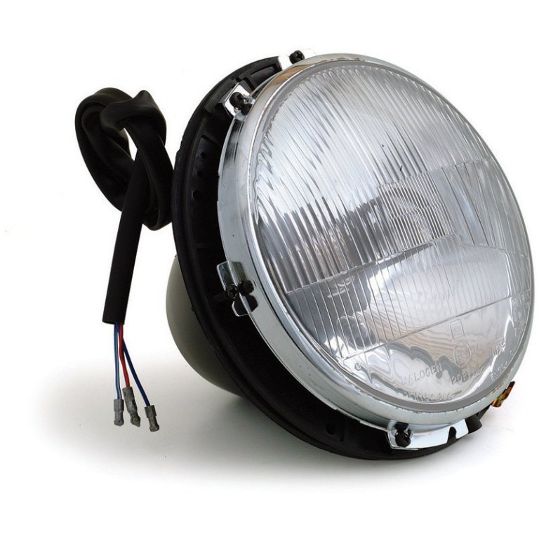 Main and dip beams with side light, metal reflector, plastic backshell, gasket and wiring harness. 'E' Marked. No Rim. Fitted with 12 volt Halogen bulb 60/65 watts and 5 watt side light bulb. Dips to the right hand side of the road