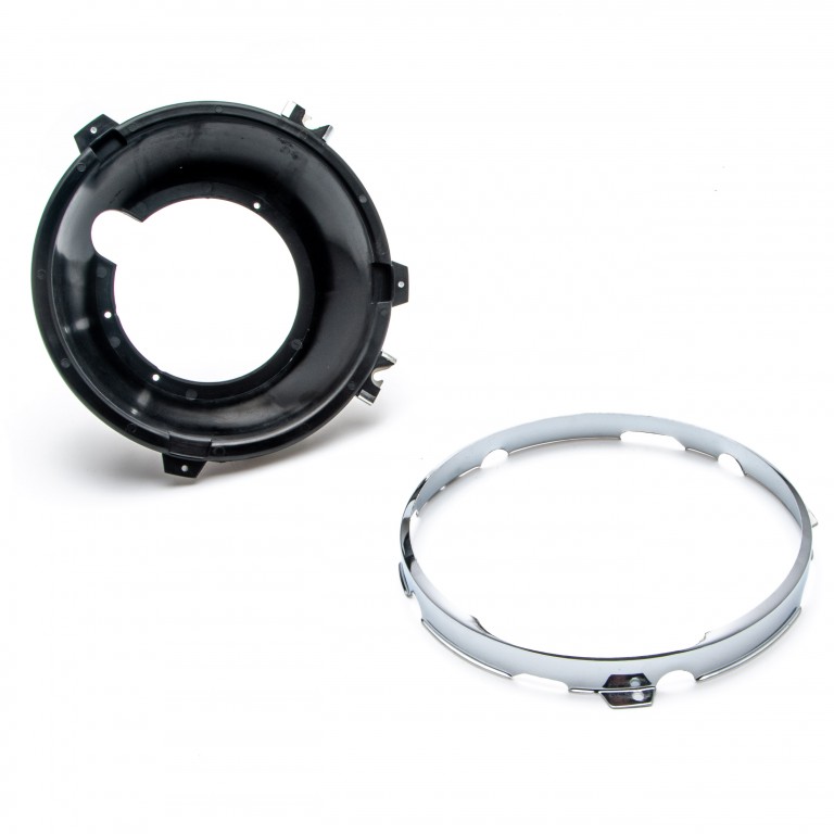 Chromed retaining rim and inner seating dish set for 2 adjuster headlamps, 54058414. This is the part of the 2-Adjuster headlamp in which the light unit is fitted