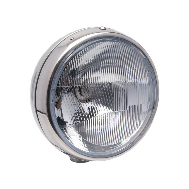 Reproduction of the Lucas S700. Polished steel Freestanding Headlamp, 7 in diameter. Complete with RHD (dips to the left) halogen light unit and bulb, also side light and bulb. The light unit has a polycarbonate lens.