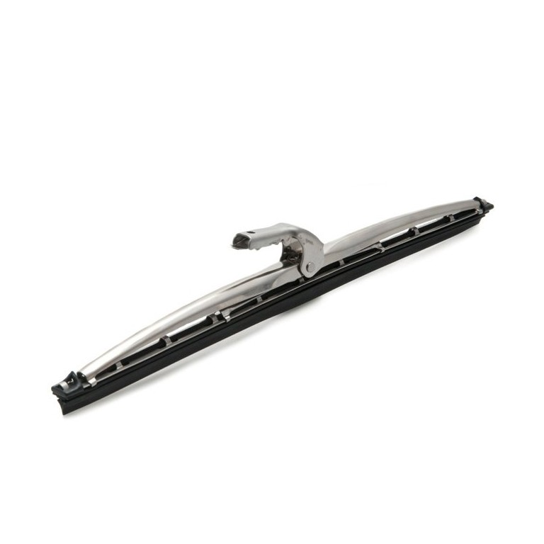 Wiper blade for curved or flat screens. Period style, made in two parts with a hinge in the centre. The backing is stainless steel
