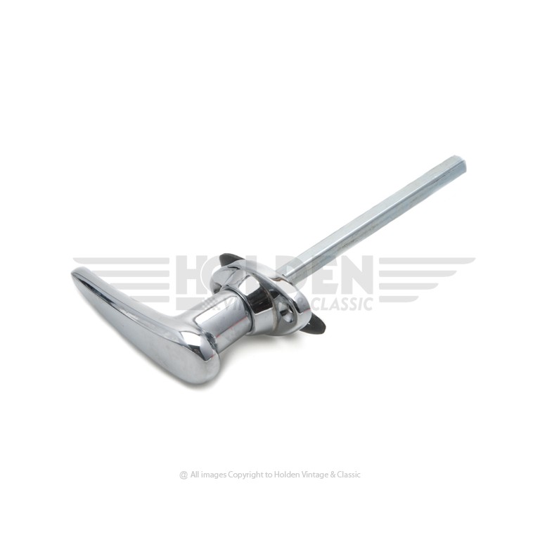 The handle is 105 mm (4 1/8) long. Hole centres in plate are approx 44 mm (1.75) apart. Shaft is 5/16 square and 127 mm (5) long. For the matching locking handle refer to 060.0 33