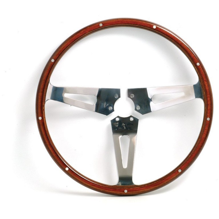 An original style split-spoke Cobra Steering Wheel by Mota-Lita. As OEM suppliers to AC Cars during the '50s and '60s, Moto-Lita has re-introduced certain period wheels. This one is the original, correct Cobra pattern wheel, with a split center, and 6 bolt fixings. This wheel fits the original Cobra boss only.