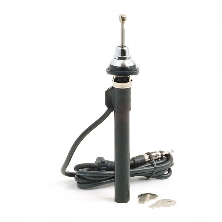 Stainless steel. Requires hole 20mm diameter in wing. Can be pushed manually into the wing and locked. Closed 40mm, extends in four sections to 780mm. Adjustable angle head. High efficiency screened cable 1400mm long with jack plug. Clearance required underneath 285mm