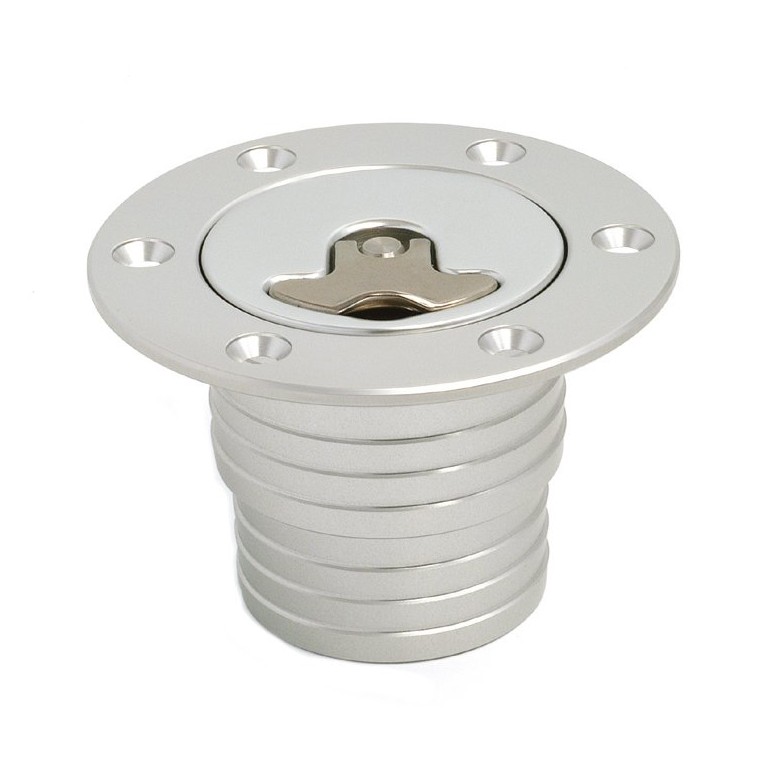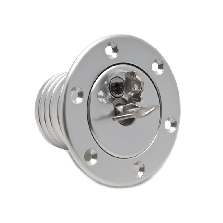 Made in silver anodised aluminium, this flush fitting filler cap graces the flanks of some of the world's most exclusive high performance cars. It is surface mounted via the included funnel / neck which is suitable for both 2 and 2.25 in hose. This cap is not vented. Supplied with cork gasket and countersunk stainless steel nuts and bolts for surface mounting. As an alternative we offer a mounting ring with captive nuts if access to the underside is a problem.. Particularly suitable for use on Kit Cars as it is flush mounting, therefore complying with the prevailing I.V.A. Regulations. A locking version is also available