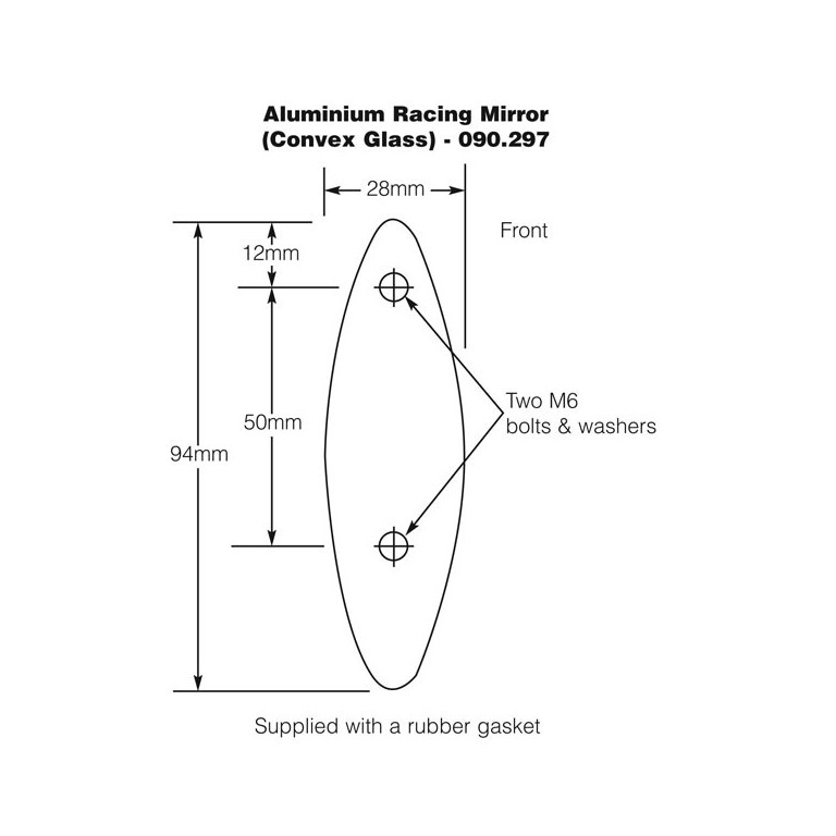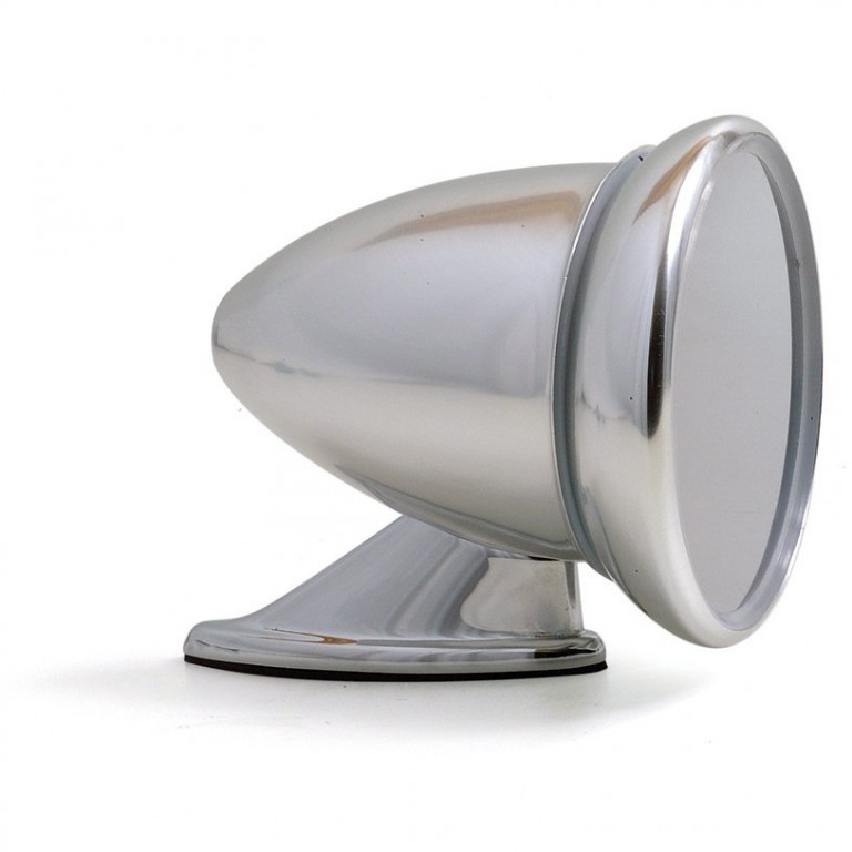 Lightweight aluminium wing mounted racing mirror with a chrome base and two bolt fixings. Convex glass 100mm diameter with a viewing area of 85mm.