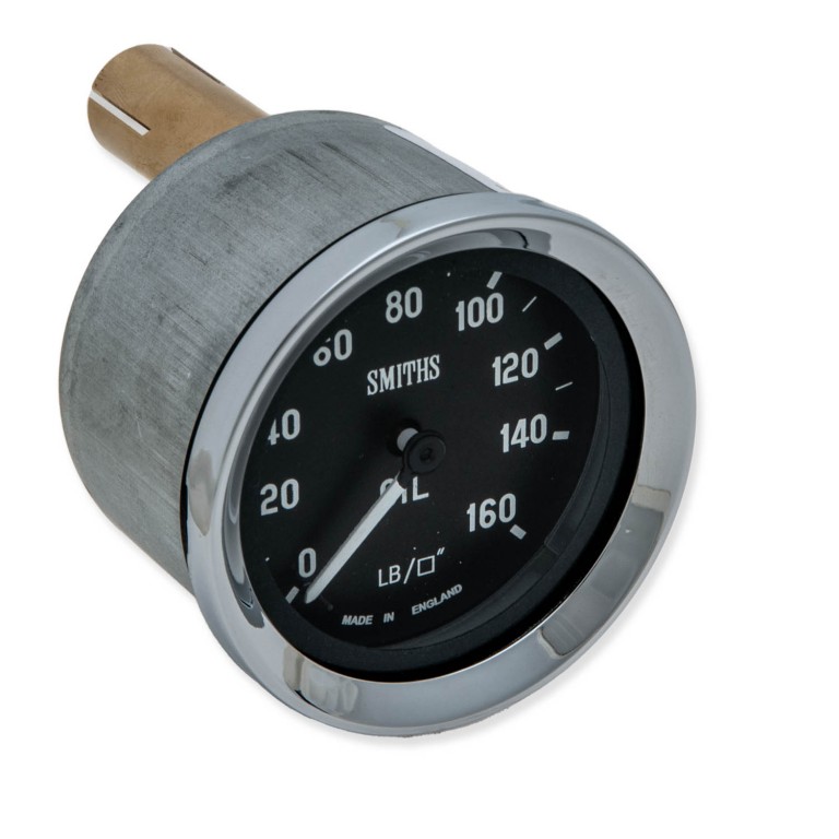 Aston Martin DB6 Smiths Oil Pressure Gauge. 52mm diameter, flat chrome bezel.