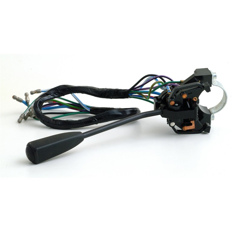 Column mounted Indicator Switch with Headlamp Main/Dip and Horn Push as fitted to Austin/Morris 1100 Mk II and 1300. Also fitted to Riley Kestrel 1300 Mk II, Wolseley 1300 Mk II and Vanden Plas Princess 1300, Lucas 35840. No markings on knob. Fits columns of approx 30 mm diameter. 13H7778