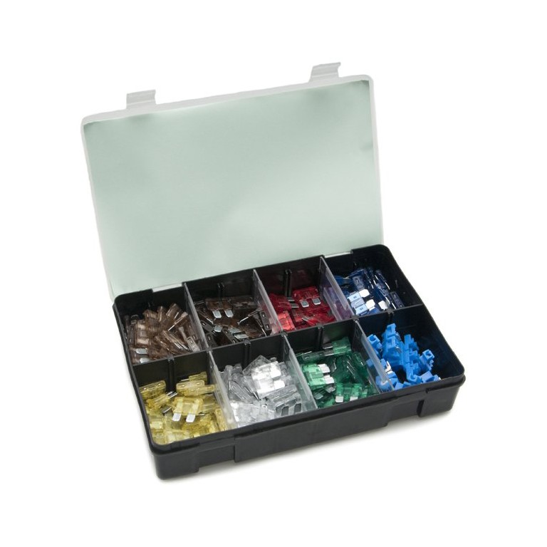 A selection of Blade Type Fuses in a plastic box with a clear lid. 40 off each 5 amp, 7.5 amp, 10 amp, 15 amp, 20 amp, 25 amp and 30 amp and 5 off Blade Fuse Holders (enables you to make a Blade Fuse into an in-line fuse)