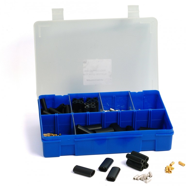 Bullet Terminals and Connectors packed in a substantial plastic box with a clear lid, offering a selection of bullet terminals to suit popular wires sizes, and both single and double bullet connectors, as well as a few 5 way connectors. Ideal for storing these parts in your workshop or garage so that you can find them easily when needed