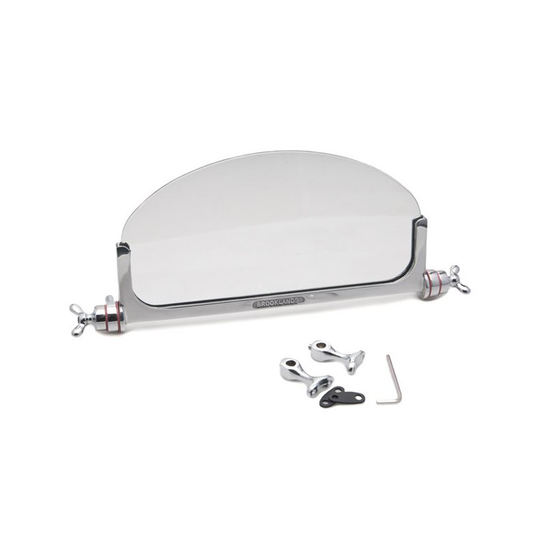 Triplex laminated glass conforming to MSA competition regulations. Polished aluminium frame with chrome fittings. Overall width 406 mm (16). Glass is 300 x 145mm (Approx 12 x 6 ) Centres between mounting points is 325mm (13) and the supplied posts will stand the screen roughly 35mm (Approx 1.5) above a flat panel For this part number the glass is cut to a radius at the top. A square cut version is available.