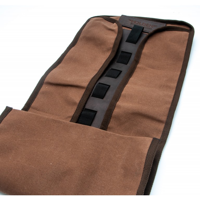 Brown canvas tool roll with the Holden Logo. Holds up to 7 tools (Not included).