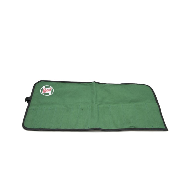 Canvas tool roll with 15 compartments and Castrol embroidered logo on the front and two straps