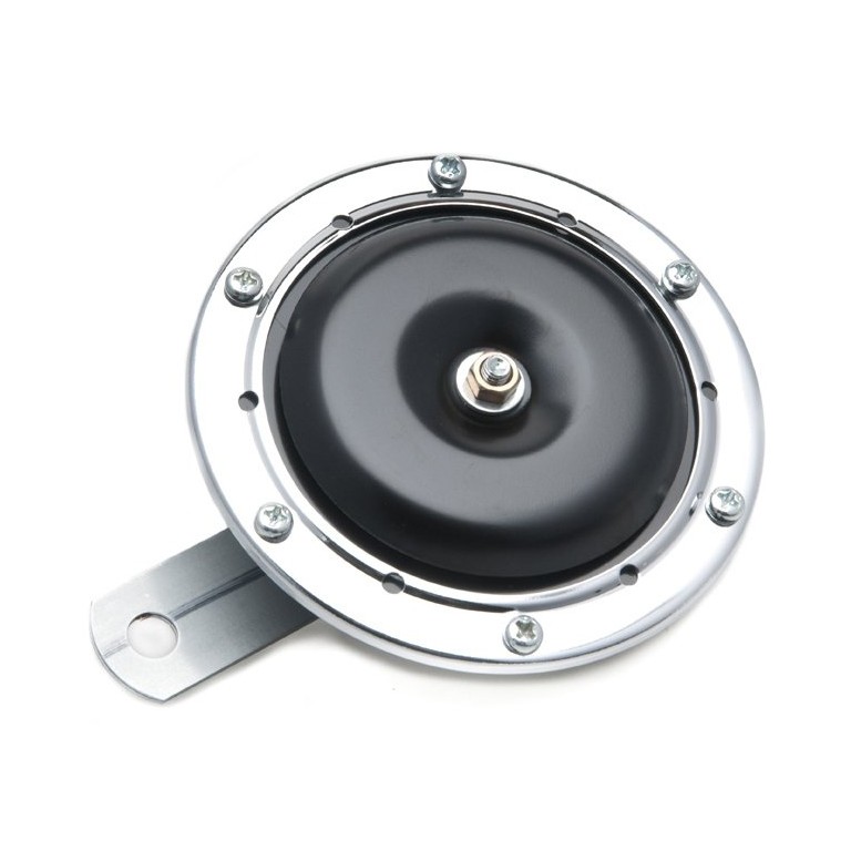 Chrome rim with black centre, twin Lucar 6.4 mm terminals. This Horn is 'E' marked.12 volt. Click the link below to hear the horn sound.
