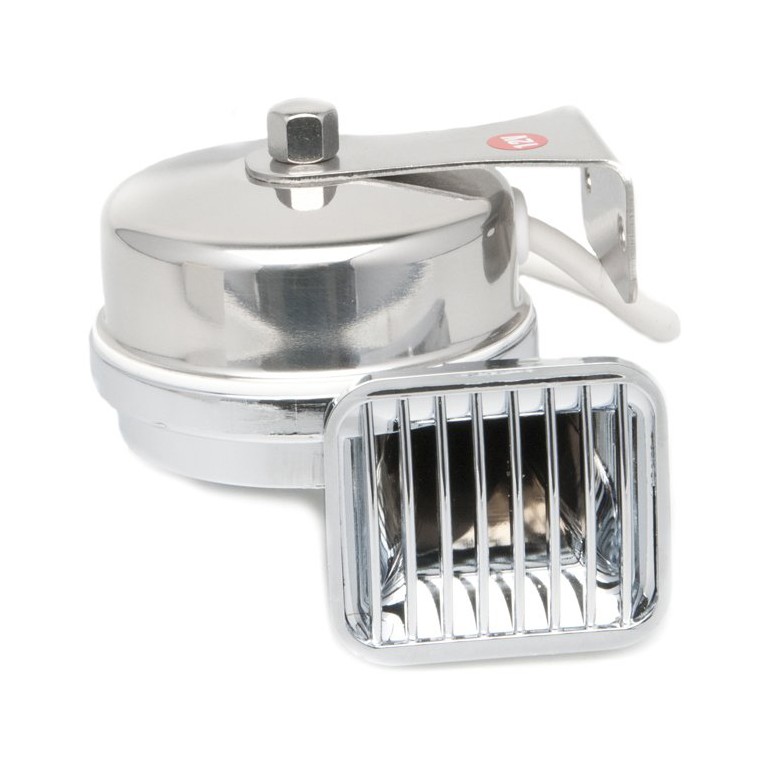 Made from stainless steel and chromium plated brass. Supplied with a short length of wire ready for you to fit your own terminals and a mounting bracket. Wiring instructions are included. A low tone version is also available. 12 volt. Click on the link below to hear the horn sound.