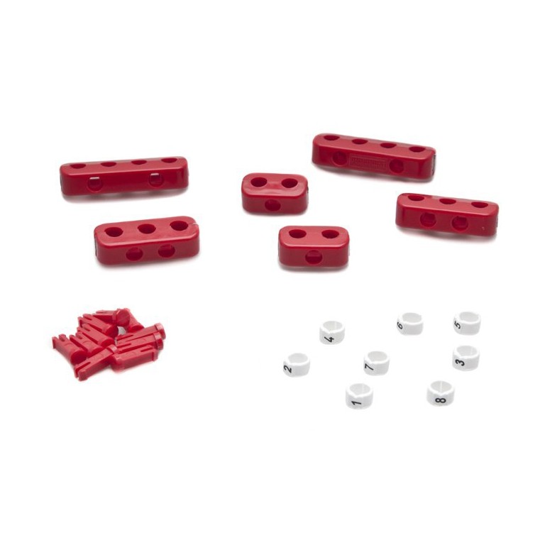 Comprises six clamps in red plastic, each of which clips together using the pegs supplied. Two for four leads, two for three and two for two. Also included are cable markers for identification of ignition leads, numbered 1 to 8. Also a sachet of silicon compound for application to coil and distributor covers to make a moisture seal on these connections. For equivalent in blue refer to 030.096