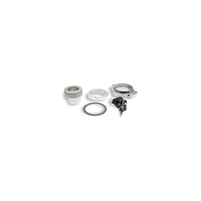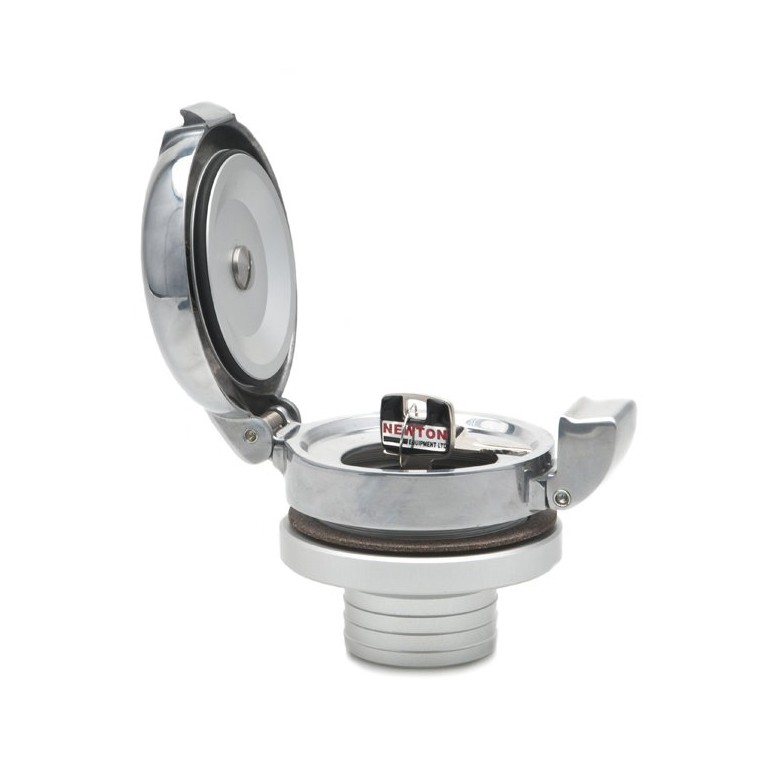 This alloy filler cap has the quick release action of the traditional Aston cap but with smoother lines. It is supplied with a filler neck to take a 2 in (50mm) diameter tank hose and a locking insert with 2 keys. Essentially a complete replacement classic style fuel filler with the added security of a locking facility. The diameter of the cap is 100mm and 131mm over the hinge and clip