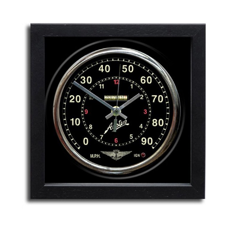 A wall clock based on the speedometer of this classic car. It measures approximately 254mm x 254mm (10in x 10in) and runs from a German precision quartz movement powered by an AA battery. We don't supply the battery, enabling you to obtain and fit a fresh one locally. This clock is individually handmade and the clock face is printed using a fine art print process and completed by a glass front in a wooden frame