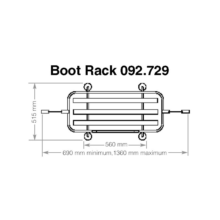Made from polished stainless steel and guaranteed against corrosion. It sits on four rubber feet on the boot lid and is retained on the edge of the lid by adjustable clamps. Alternatively, the four feet are tapped M6 and it would be possible to bolt through your boot lid into the feet to secure the rack permanently. Platform size 880 mm wide by 375 mm deep. Will fit across boot lids from 690 to 1360 mm wide and at least 515 mm from front to back