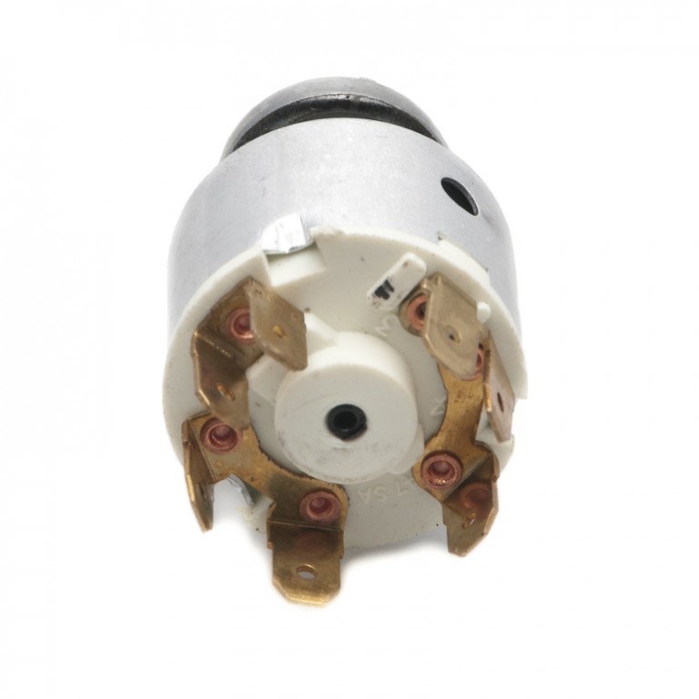 Quality reproduction of the Lucas combined ignition and starter switch with left position for auxiliary circuits such as radio, 34680. With chrome bezel and Lucar connectors. Requires 19.6 mm diameter hole. Rated at 5 amps for Ignition, 16 amps for Starter and 15 amps for Auxiliary. A switch of this type was fitted to MGB and TR6. Supplied complete with key and barrel. It should be noted that the wiring diagram shown here is physically correct for the switch, but the terminals on the base are marked incorrectly. Terminal 1 on the switch corresponds to Terminal 3 on the diagram and visa versa.