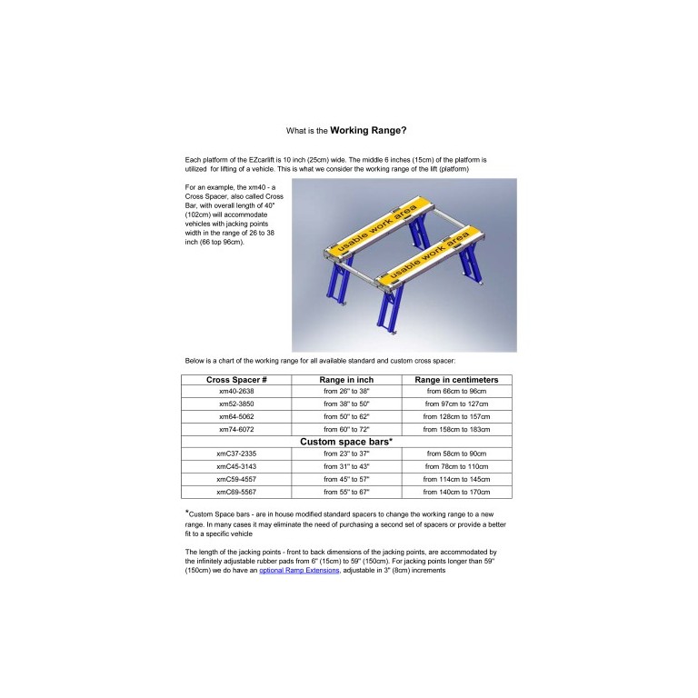 Part of E-Z Car Lift. Comprises two cross spacer bars, a drive bar and a slave bar, a set of wheels and everything you need to assemble the lift. Measure the width across the jacking points on your car and select the appropriate width of lift you require, This set provides a working range of 115 to 145cm (45 to 57 in). There are a number of optional extras available see Part Nos 091.970, 091.971, 091.975, 091.990. For more information, you can refer to the American manufacturer's website - ezcarlift.com. Refer also to that web site for assistance in selecting the correct cross spacer kit for your car. This one has the American Part No. xm59 on their application list.