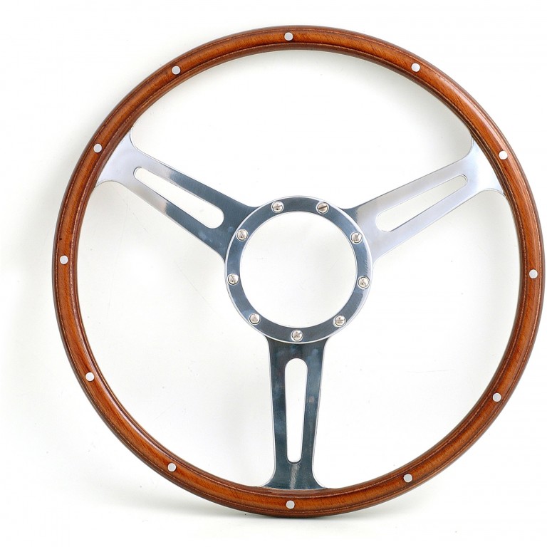 As originally supplied by Moto-Lita to VW Derrington. Hand-built from cross-laminated wood, bonded and riveted to a one-piece, heavy-gauge, hand-polished, aluminium alloy frame. The underside of the rim has 36 finger notches. The rim is finished in a deep lustre, resistant to petrol, oil and the elements. It has three equally spaced spokes with slots.