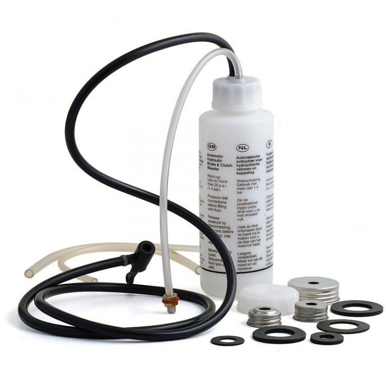 Uses the air pressure in your (spare) tyre! With a pressure vessel to hold the new fluid, a pipe with cap to fit your reservoir, and an air pipe to connect to the tyre. Operate each bleed valve in turn until clean fluid appears. You do the job in minutes and use only 1/4 lb pressure from your tyre. Several screw caps are provided. If you can't find one to fit your car contact our Helpline 01885 488 488. Full instructions provided