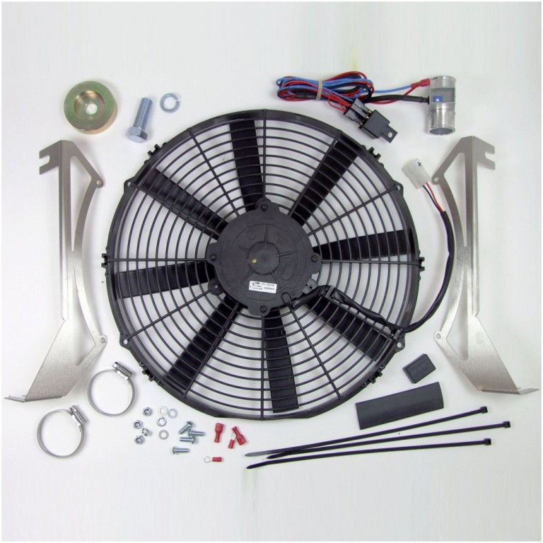 Revotec fan kit. Specifically engineered to fit and cool your Triumph TR5 and TR6. Supplied complete with quality electric fan and all necessary brackets, fixings, hose clips and connectors to provide a complete installation on your TR. Fits without any permanent modifications except for the need to cut one hose to fit the electronic temperature controller. Fits with basic hand tools. OEM components used throughout. The latest fan and controller technology are used together for the ultimate cooling package. For 12 volt negative earth only