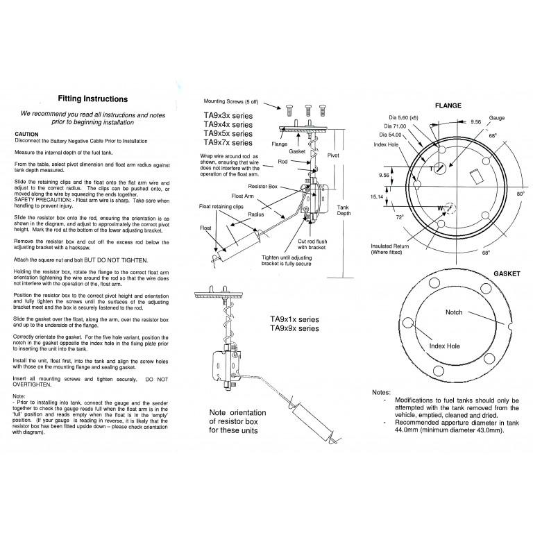 Fits to the top of the tank. Resistor box fits to a vertical rod and can be adjusted to the correct position for the pivot. Rod can then be cut to length. The float fits to the float arm and can be adjusted to the required position. Flange is 5 hole fitting. Comes with full instructions. As supplied to AC Cars right up to and including the Mk 4. Adjustable between 6 and 24 earth return 10-180 ohms. Blade terminals Click here to see our PDF on testing fuel senders.