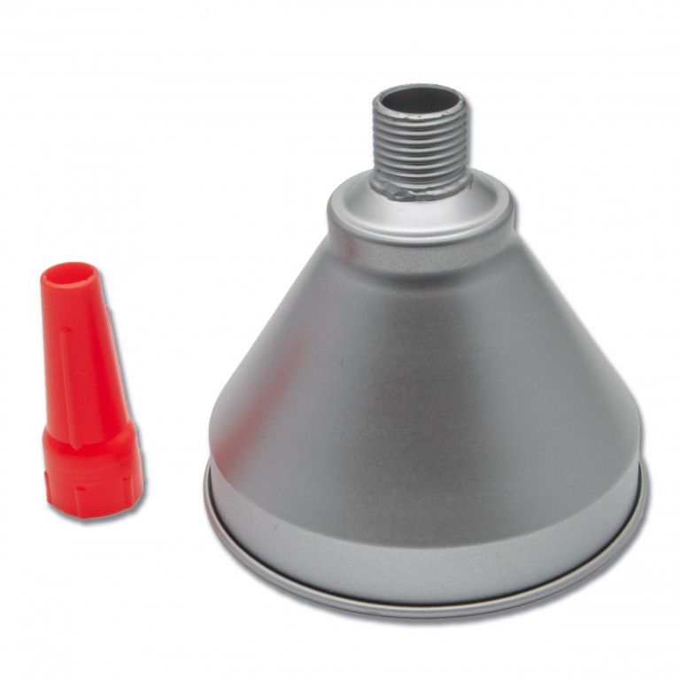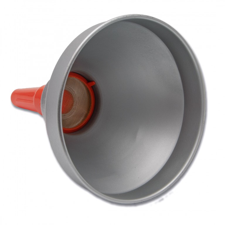 Heavy-duty steel funnel with 'Dacromet' coating finish, removable brass strainer, and screw-on metal spout.