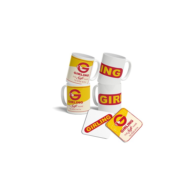 Girling Coaster & Mug Set (2 Pack) 2x Girling design ceramic 330ml mugs with a full colour wrap around print. Dishwasher resistant up to 800 wash cycles at 45°C. Bright white in colour and with a high gloss finish. 2x matching Girling design coasters. Pack includes: 1x Girling Safe Name Ceramic Mug 1x Girling Logo Ceramic Mug 1x Girling Safe Name Coaster 1x Girling Logo Coaster