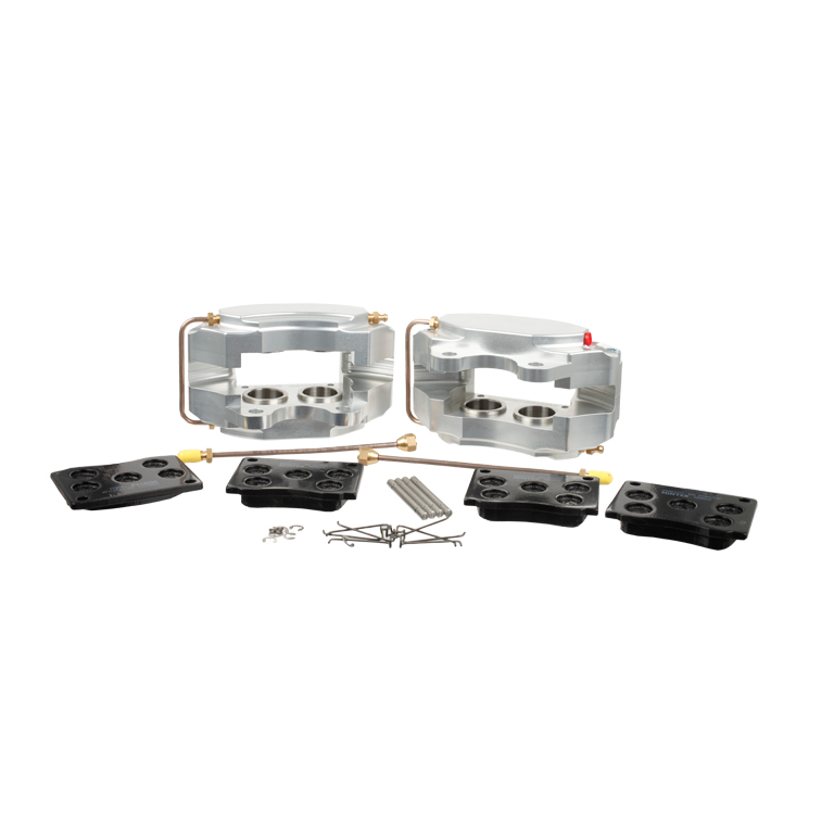UK manufactured four pot front brake caliper conversion kit in aerospace grade 7075 grade silver aluminium.