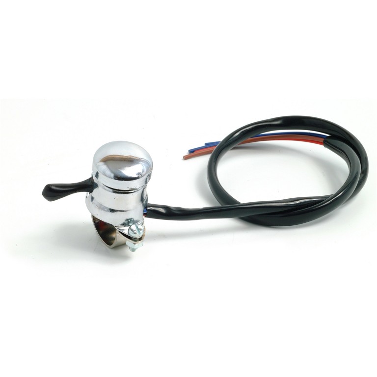 Reproduction of Lucas chrome Horn/Dip Switch complete with wiring harness. For 7/8' handlebar
