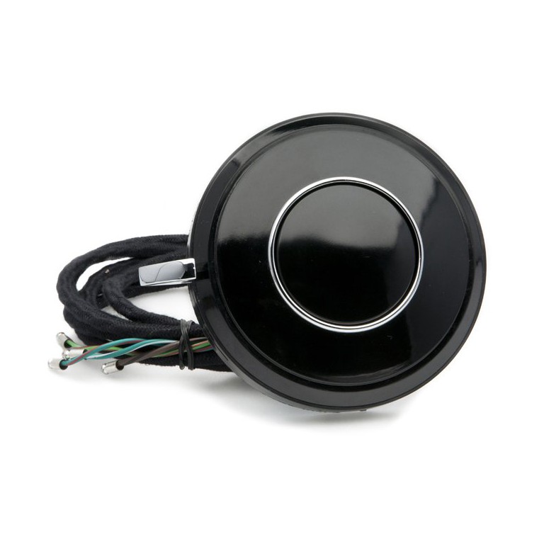 Steering wheel centre as fitted to a number of cars including the Triumph TR2 and TR3. Provides horn button and indicator switch. 122.5 mm (4.82 inches) diameter. Rear has flange with three mounting holes. Long 165 mm (6.5 inches) tube at rear