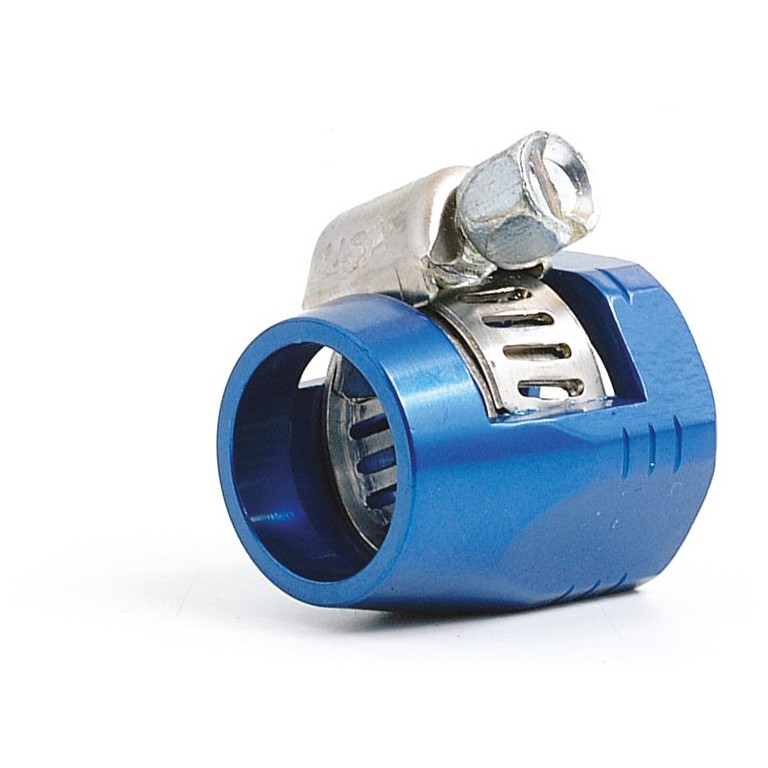 For cotton over braided or stainless steel covered Fuel Hoses 015.216 and 015.282. Slip over end of hose and tighten, the finisher hides both the clip and the end of the hose. For the red one refer to 091.600