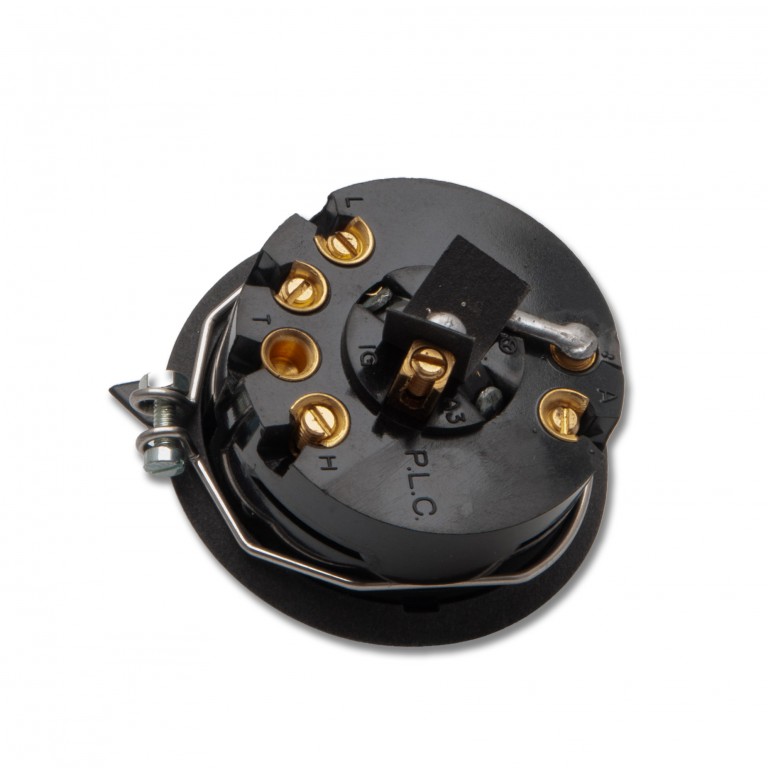 Ignition and Lighting Switch, OFF-SIDE-HEAD. Requires 52 mm diameter hole and secures with clip included. Screw type connections for the wires. Two keys supplied. Lucas PLC5 switch, 34057, where the position markings are printed on the outside of the switch body. A later version with a 'window' to indicate the switch position is also available.