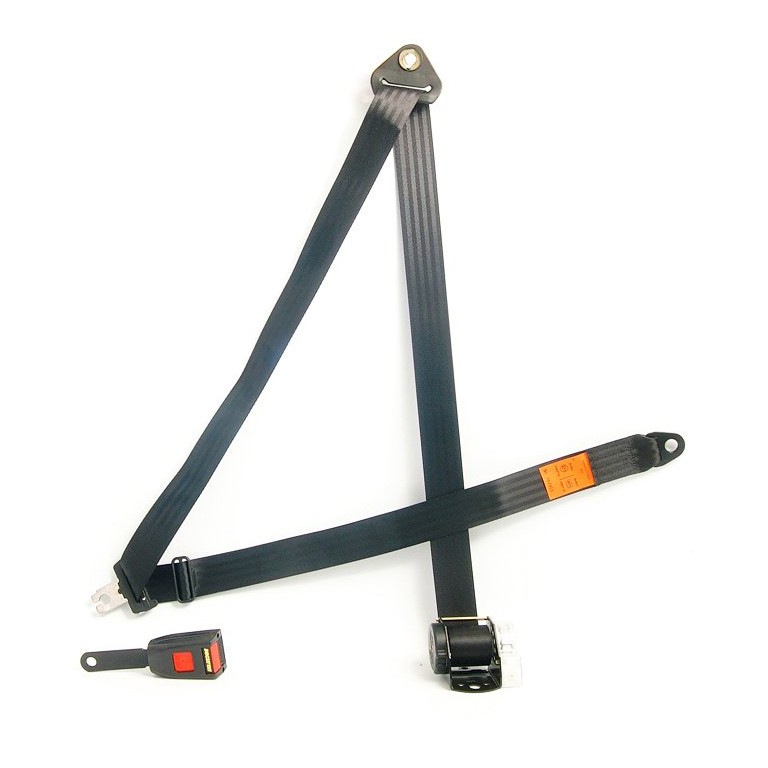 Inertia Reel type Seat Belt. The top fitting is for mounting on the 'B' post, the inertia reel mounts at floor level with the belt exiting the reel vertically. The 'stalk' on this version is 150mm long and is suitable for mounting directly to the seat frame, transmission tunnel, or side sill. The length of the belt is 286cm.