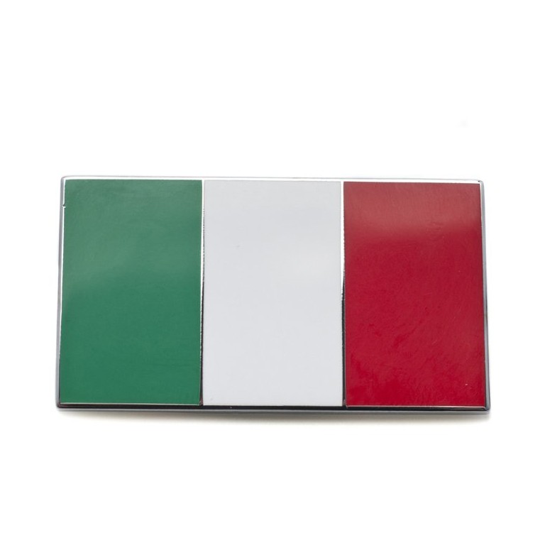 A metal enamelled badge with an adhesive backing showing the flag of Italy. 50mm x 29mm