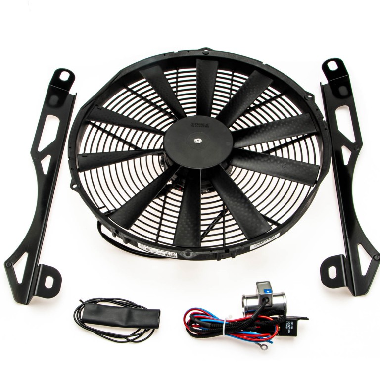 Radiator cooling fan upgrade kit - Revotec electronic fan controller, COMEX electronic cooling fan and vehicle specific engineered mounting brackets. The kit contains a 14" COMEX high power, slimline and waterproof blowing fan, laser cut aluminium mountin