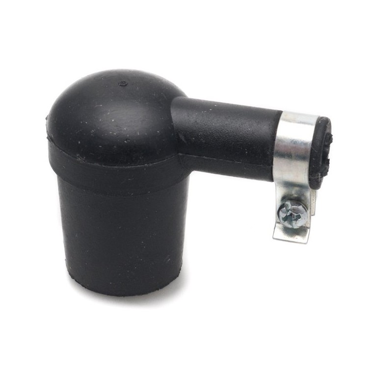 Right angled rubber spark plug cap - not suppressed, so ideally suited for use with magnetos or on ignition systems where suppression is not required. Screws onto the ignition wire and is a push fit onto the plug.